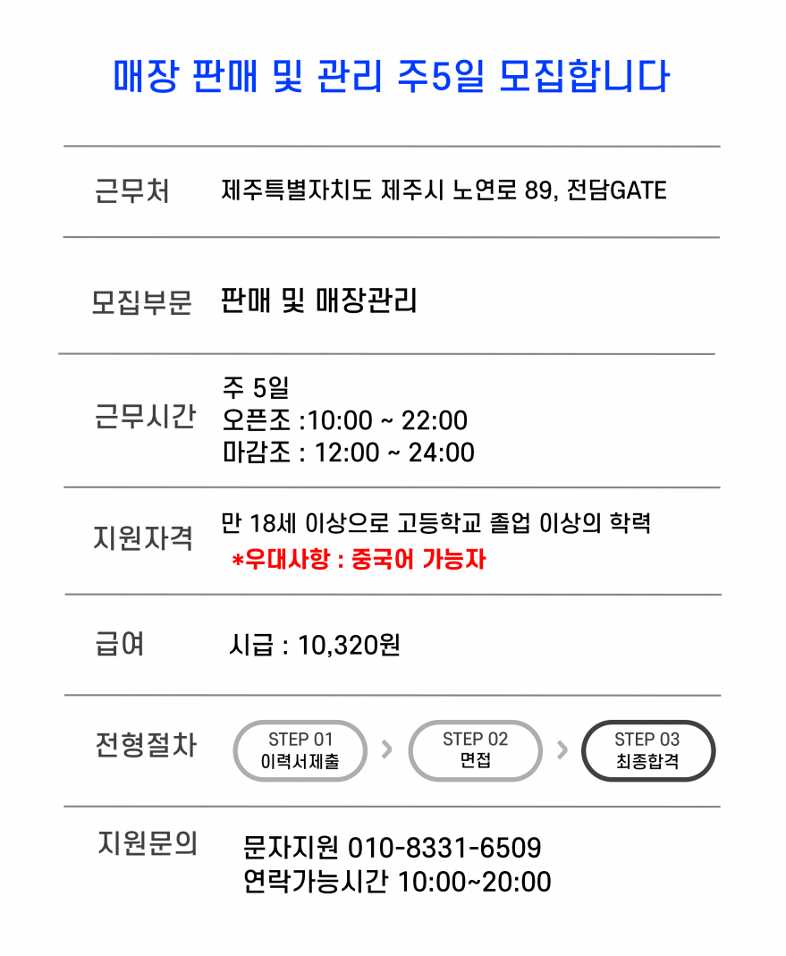 ★★★세상에서 제일 쉬운 판매직 직원을 구합니다★★★ 페이지 정보 작성자 곽O식 작성일25-10-29 17:54 조회94회 연락처 010-8331-6509 급여 시급 : 10,320 관련링크 본문 ■ 주업무 : 고객이 물건 선택하면 결제 후 봉투에 담아드리기. 외워야 할 내용 거의 없음. ■ 근무지 : 연동 주소 : 제주특별자치도 제주시 노연로 89 1층 전담GATE 이전글 다음글 목록