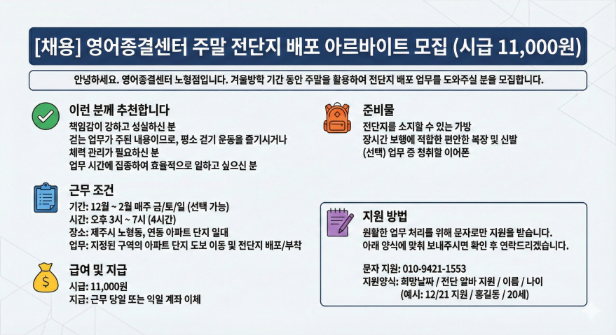 [주말 꿀알바] 영어학원 전단지 배포 알바 모집(친구랑 같이 지원!) 페이지 정보 작성자 lOOOOOe 작성일25-12-10 20:04 조회445회 연락처 010-9421-1553 급여 시급 : 11,000 관련링크 본문 주소 : 제주특별자치도 제주시 월랑로 59 세흔빌딩 6층 영어종결센터 노형학원 이전글 다음글 목록