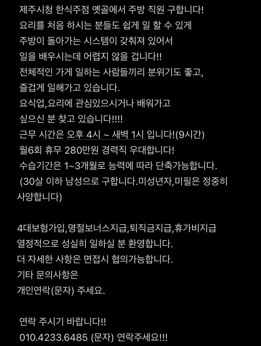 제주시청한식주점옛골에서주방직원구해요! 페이지 정보 작성자 꼬동 작성일25-09-22 18:10 조회511회 연락처 010-4233-6485 급여 월급 : 2800000 관련링크 본문 . 주소 : 제주시 광양8길 1-6 2층 옛골 이전글 다음글 목록