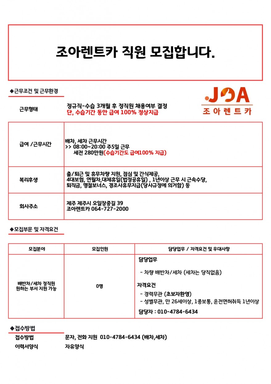 조아렌트카 배차세차 정직원 모집합니다. 출퇴근/휴무 차량 지원 페이지 정보 작성자 쎄OO어 작성일25-04-21 18:33 조회2,764회 연락처 010-4784-6434 급여 월급 : 280만원 관련링크 본문 주소 : 제주특별자치도 제주시 오일장중길 39 조아렌트카 이전글 다음글 목록