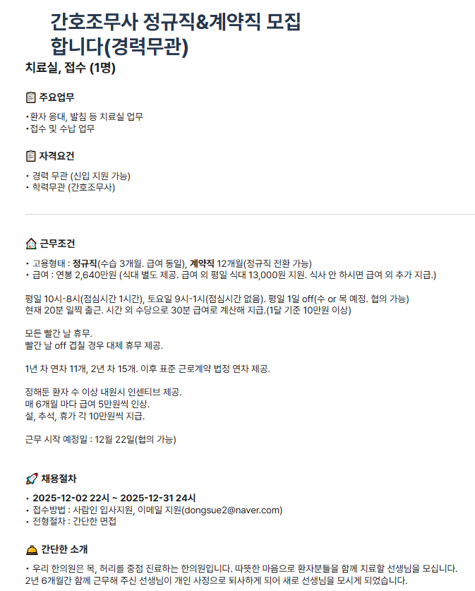 제주 이도한의원 간호조무사 선생님 모십니다. 페이지 정보 작성자 이O이 작성일25-12-09 15:59 조회180회 연락처 010-5604-0509 급여 월급 : 2200000 관련링크 본문 안녕하세요. 제주 이도한의원에서 간호조무사 선생님을 모십니다. 주소 : 제주특별자치도 제주시 승천로 81 2층 이전글 다음글 목록