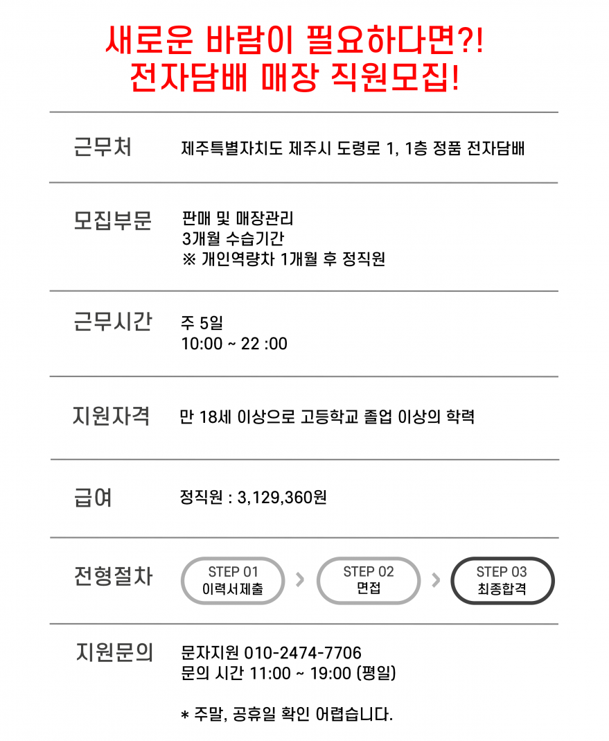 ♥︎♥︎새로운 바람이 필요하다면?! 전자담배 매장 직원모집!♥︎♥︎ 페이지 정보 작성자 아OOO우 작성일25-12-08 18:04 조회235회 연락처 010-2474-7706 급여 월급 : 3,129,360 관련링크 본문 부재 시 문자로 이력서 보내주세요부재 시 문자로 이력서 보내주세요 주소 : 제주특별자치도 제주시 도령로 1 1층 전자담배매장 이전글 다음글 목록