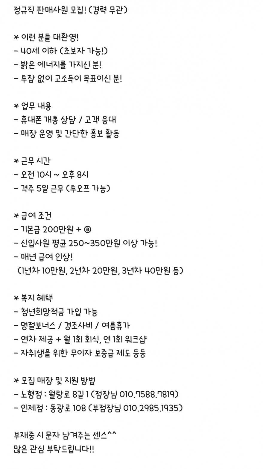 휴대폰매장⭐️월250~350만원⭐️직원구함 페이지 정보 작성자 아O라 작성일25-12-05 16:24 조회231회 연락처 010-7588-7819 급여 월급 : 250만원 이상 관련링크 본문 - 주소 : 제주 제주시 월랑로 8길 1 이전글 다음글 목록