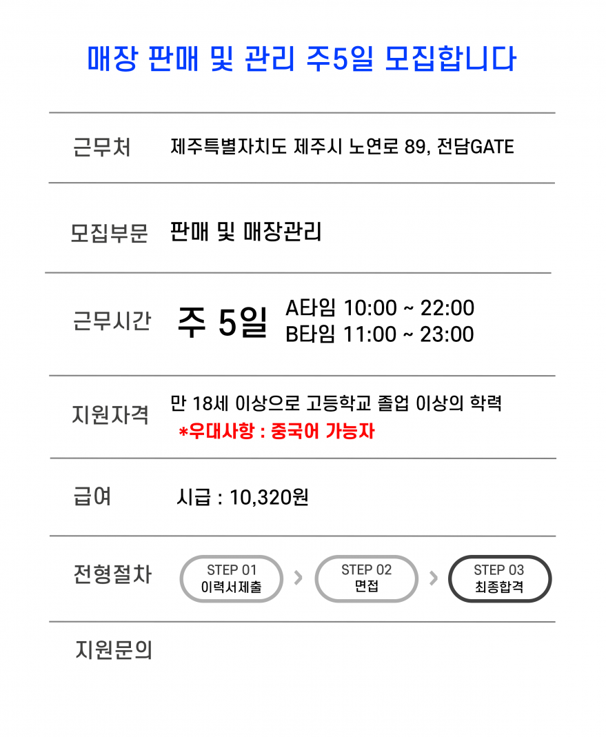 ★★★세상에서 제일 쉬운 판매직 직원을 모집합니다★★★ 페이지 정보 작성자 곽O식 작성일25-12-04 17:48 조회310회 연락처 010-8331-6509 급여 시급 : 10,320 관련링크 본문 ■ 주업무 : 고객이 물건 선택하면 결제 후 봉투에 담아드리기.외워야 할 내용 거의 없음.■ 근무지 : 연동 주소 : 제주특별자치도 제주시 노연로 89 1층 전담GATE 이전글 다음글 목록