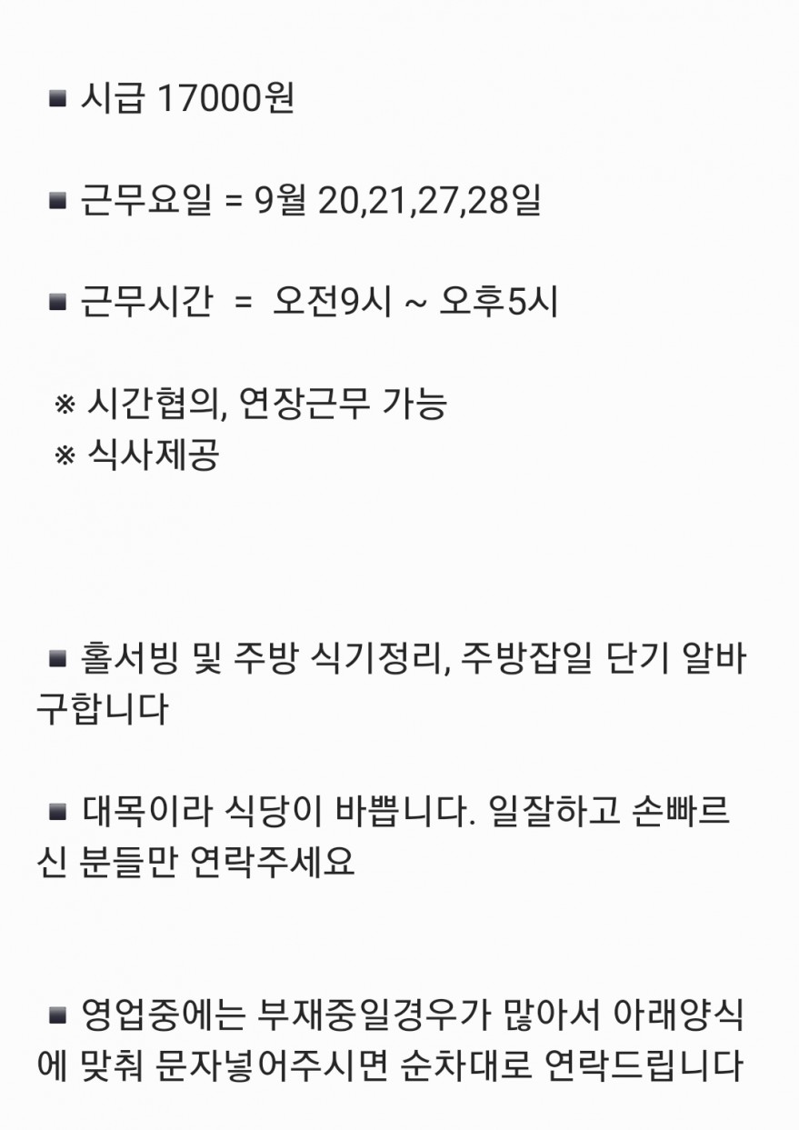 식당단기파트타임[홀서빙,주방(잡일)] 페이지 정보 작성자 pOOOOO5 작성일25-09-18 06:48 조회313회 연락처 010-4735-0155 급여 시급 : 17000원 관련링크 본문 . 주소 : 천덕로440-1 이전글 다음글 목록