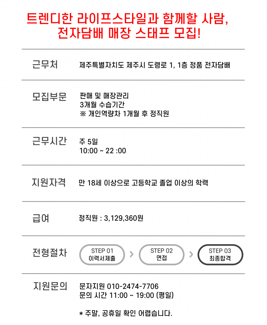 ♥♥ 내일출근하기 딱 좋은 직장 ㅡ 전자담배 전문점 직원구함♥♥ 페이지 정보 작성자 아OOO우 작성일25-11-27 18:22 조회24회 연락처 010-2474-7706 급여 월급 : 3,129,360 관련링크 본문 부재 시 문자로 이력서 보내주세요부재 시 문자로 이력서 보내주세요 주소 : 제주특별자치도 제주시 도령로 1 1층 전자담배 이전글 다음글 목록
