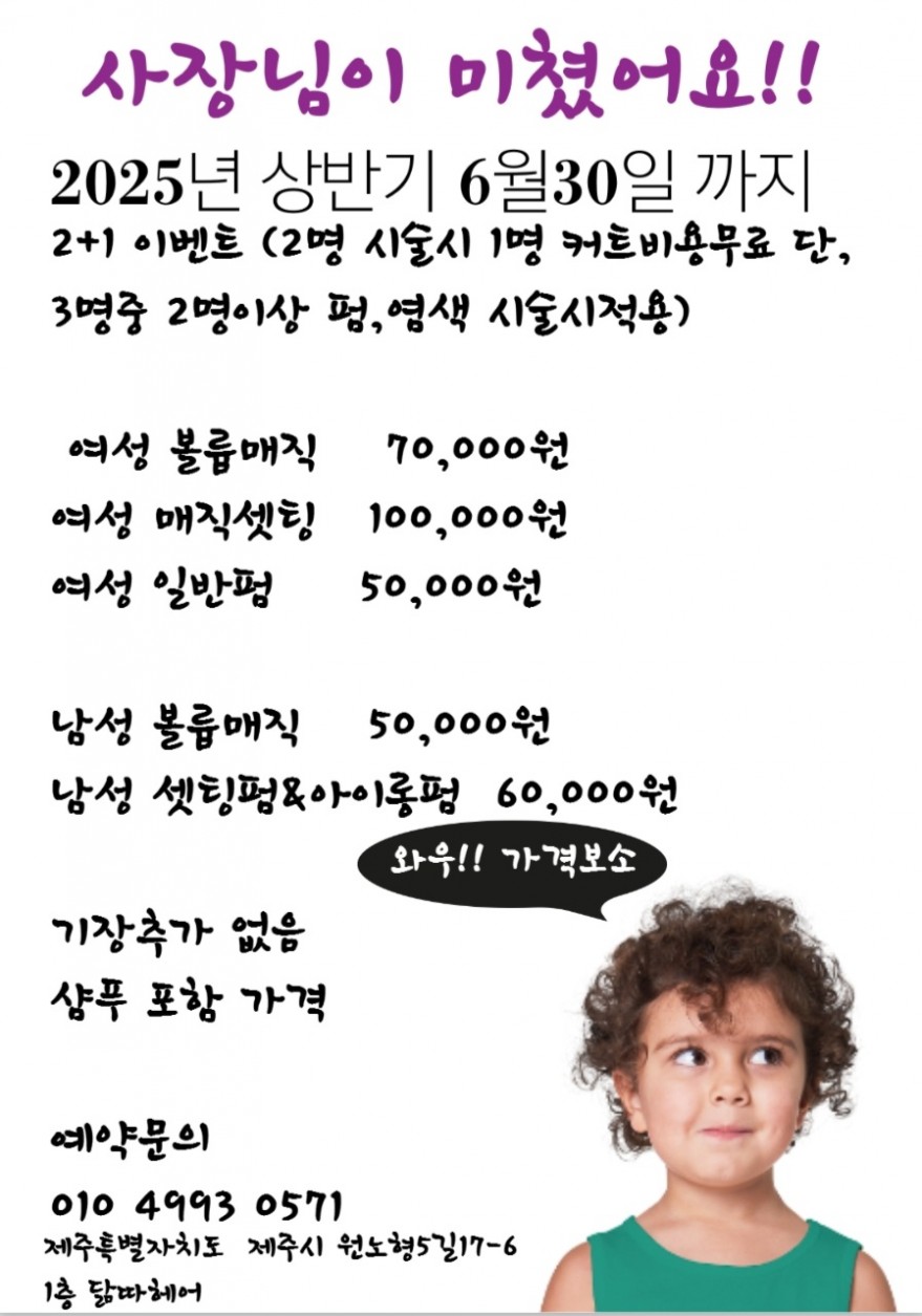 제주 노형동 가성비 미용실 닮따헤어 빅 이벤트 페이지 정보 작성자 닮OO어 작성일25-03-19 12:32 조회6,922회 연락처 010-4993-0571 관련링크 본문 이전글 다음글 목록