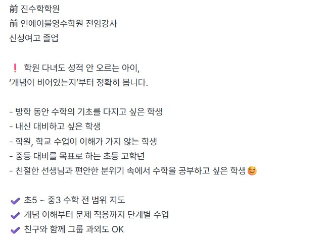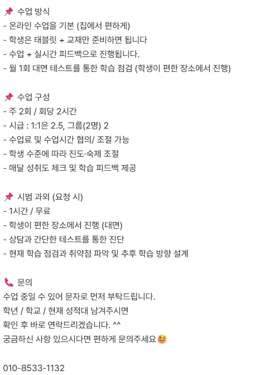 기타 | 중등수학전문과외(시범과외무료) 페이지 정보 작성자 hOOOOOOOl 작성일26-01-04 18:16 조회256회 연락처 010-8533-1132 관련링크 본문 . 이전글 다음글 목록