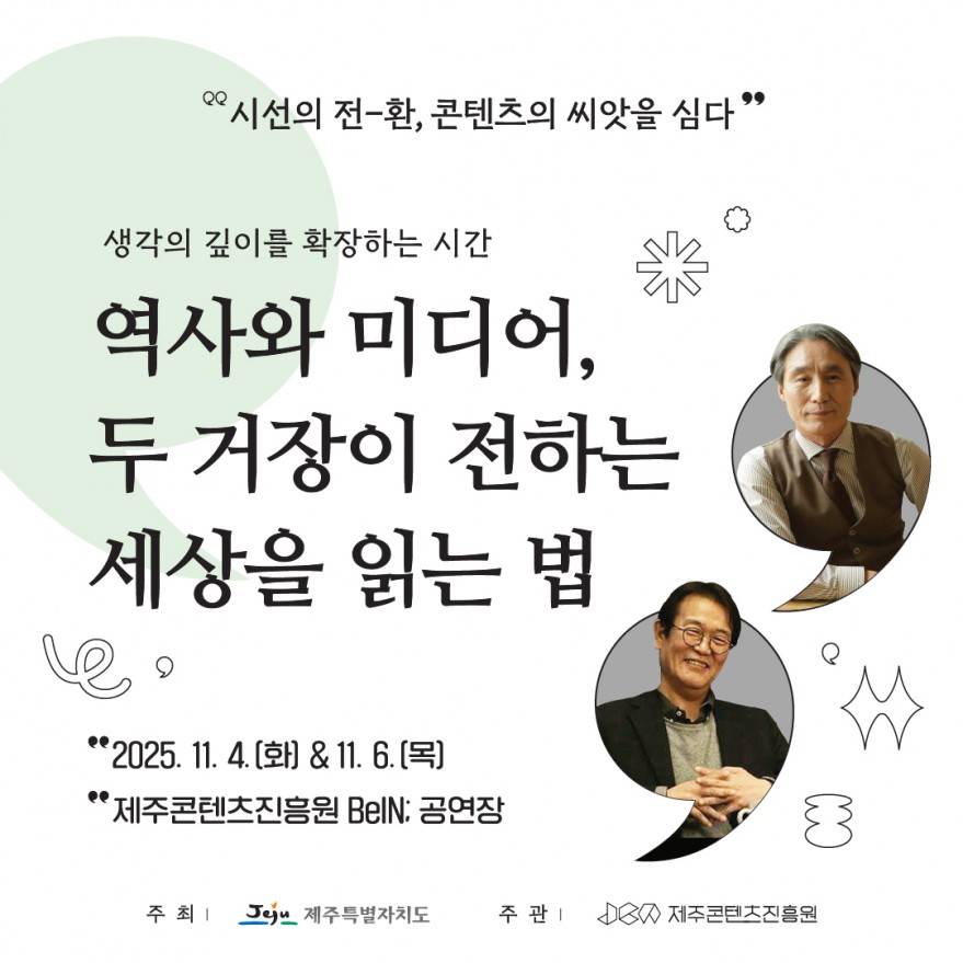 [제주콘텐츠진흥원]역사와미디어,두거장이전하는세상읽는법!(~11/5,수) 페이지 정보 작성자 함OO면 작성일25-10-24 12:37 조회173회 연락처 010-1234-5678 관련링크 본문 신청바로가기 자세히보기 이전글 다음글 목록